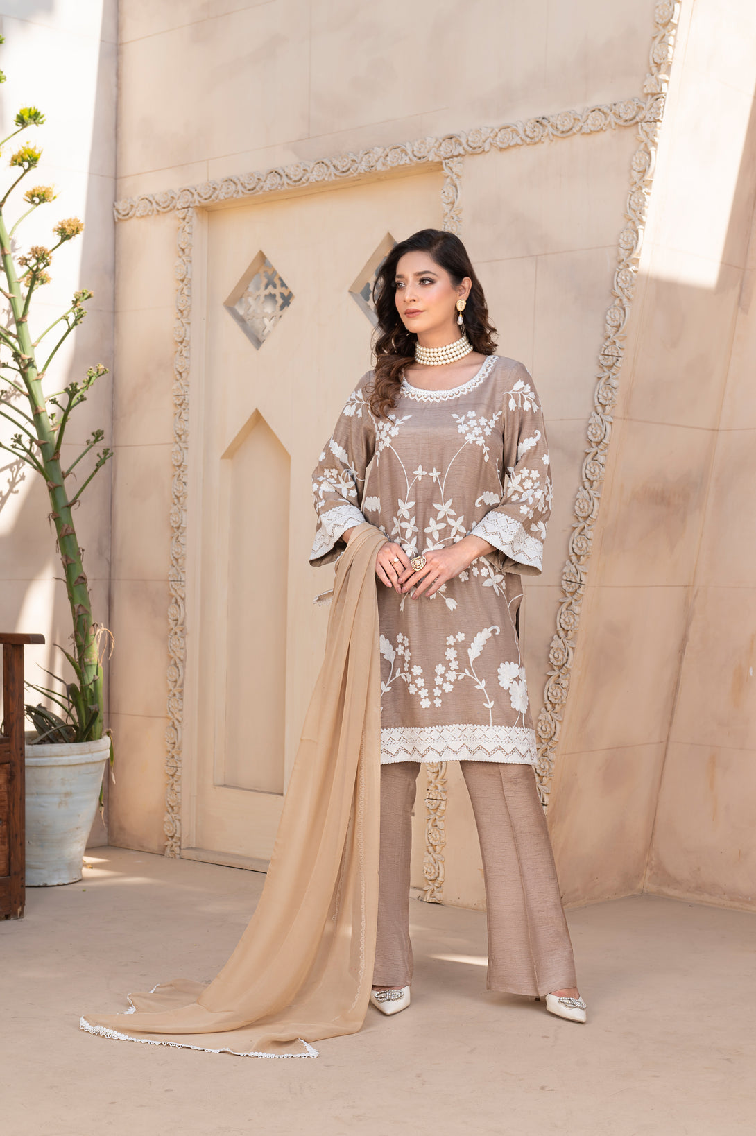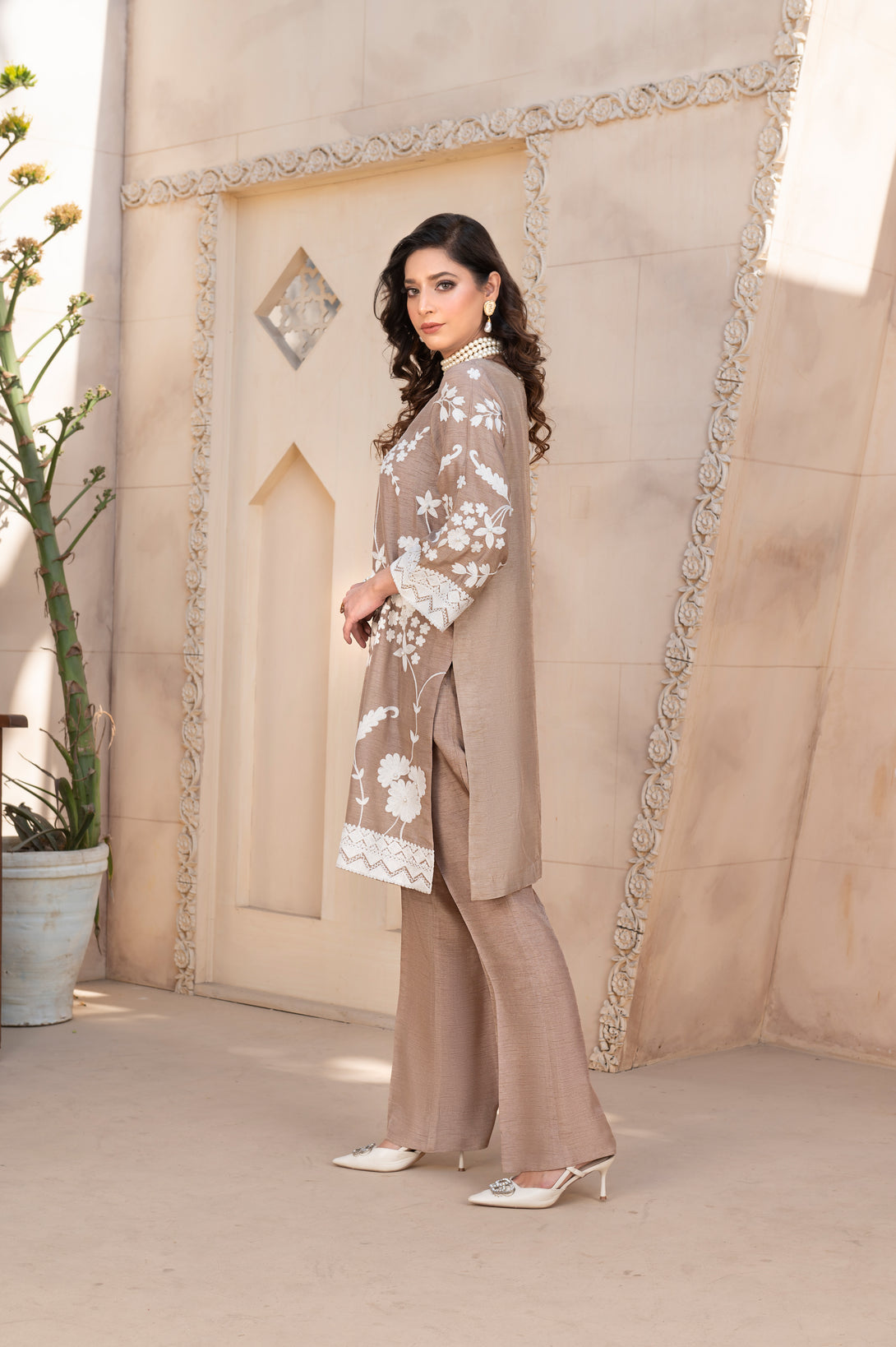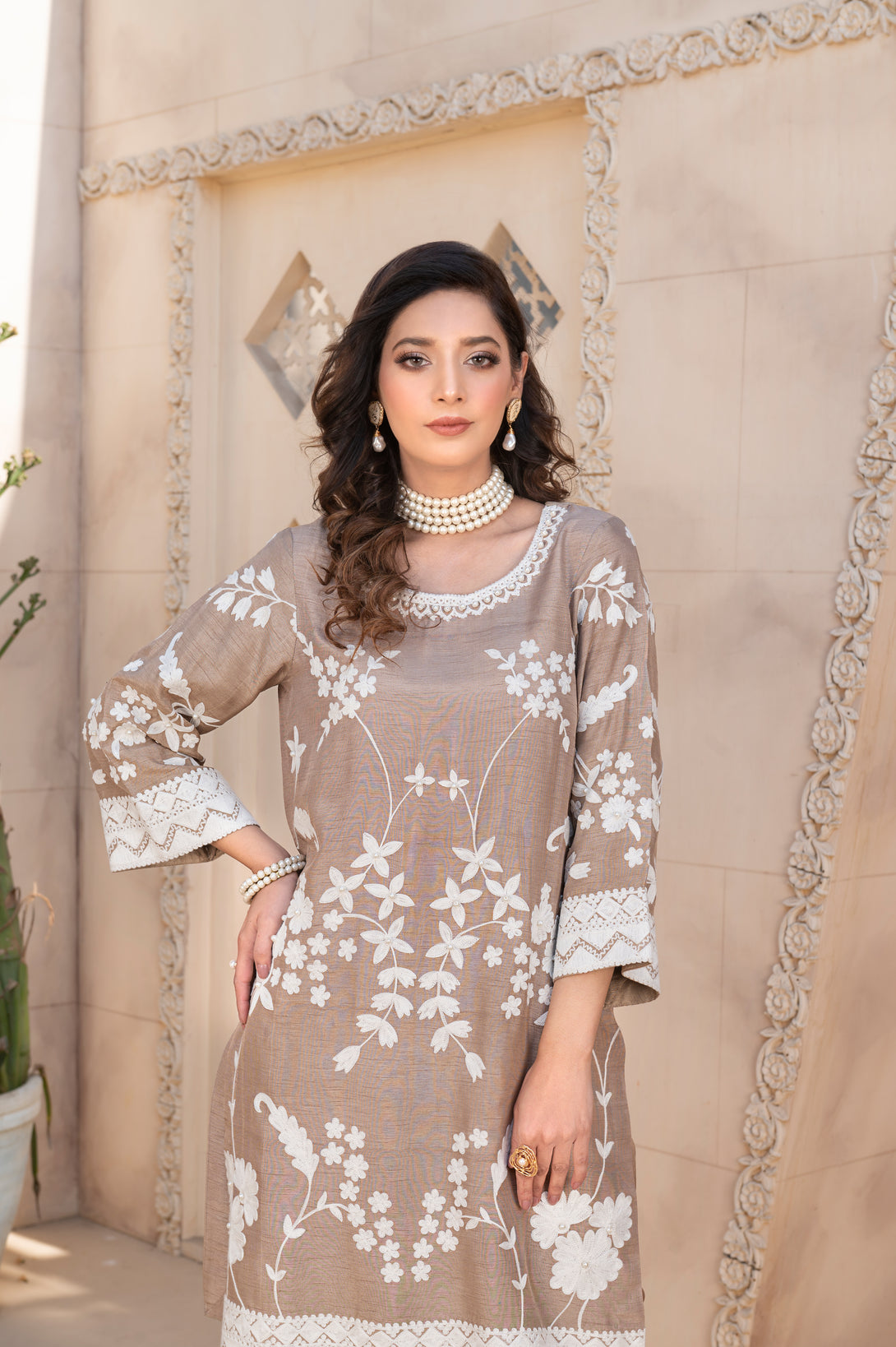 Elegant and timeless, Aira is crafted from luxurious raw silk, adorned with delicate ivory aari embroidery all over the shirt, creating a refined and graceful texture. The embroidery adds depth while keeping the look soft and sophisticated.