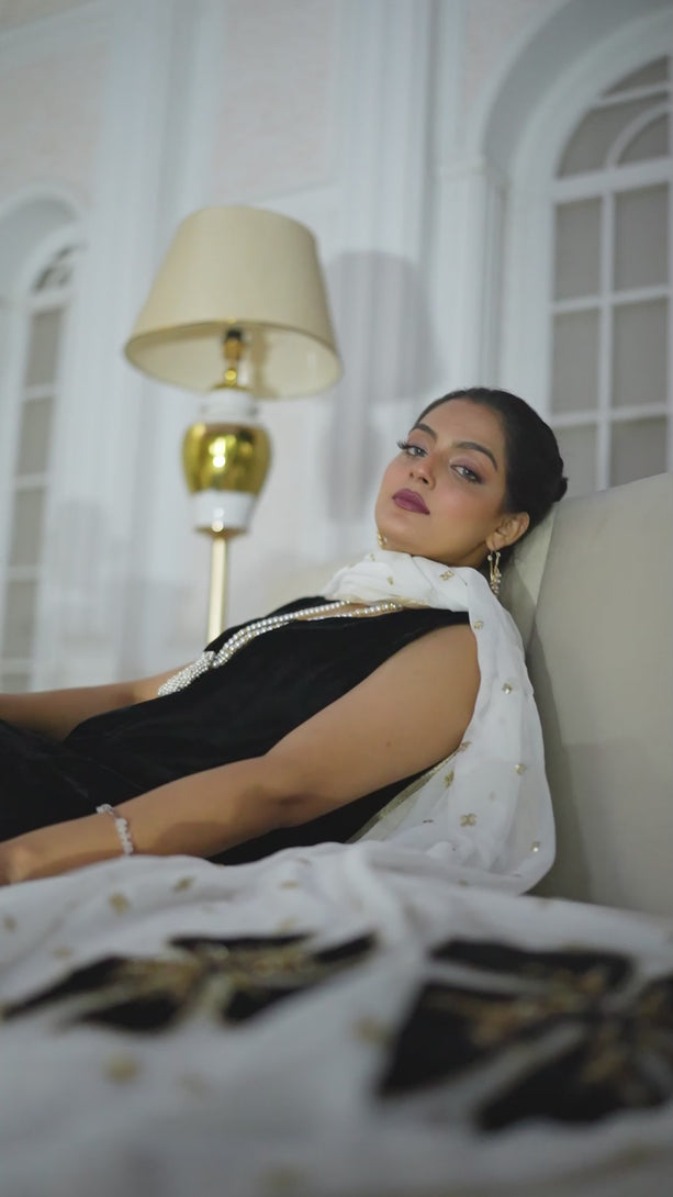 Where Luxury Meets Tradition. A timeless velvet kalidar meets the soft grace of a chiffon dupatta adorned with delicate tilla boti. Every floral motif on the velvet is elevated with hand-worked cut dana and shimmering stones, creating a look that speaks of luxury and refinement. The dupatta, finished with elegant tissue facing, adds the perfect touch of finesse. Step into the season with an ensemble crafted to make every woman feel extraordinary.