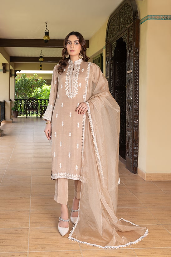 “Arsh” features delicately rendered starbusts and exquisite floral embellishment in pearl and dori on a pristine nude raw silk canvas. Paired with raw silk trouser and a sheer lace bordered organza dupatta. This ethereal and romantic 3 piece silhouette is a classic for the ages and a perfect pick for this festive season