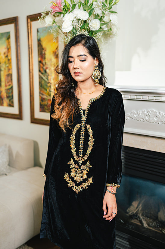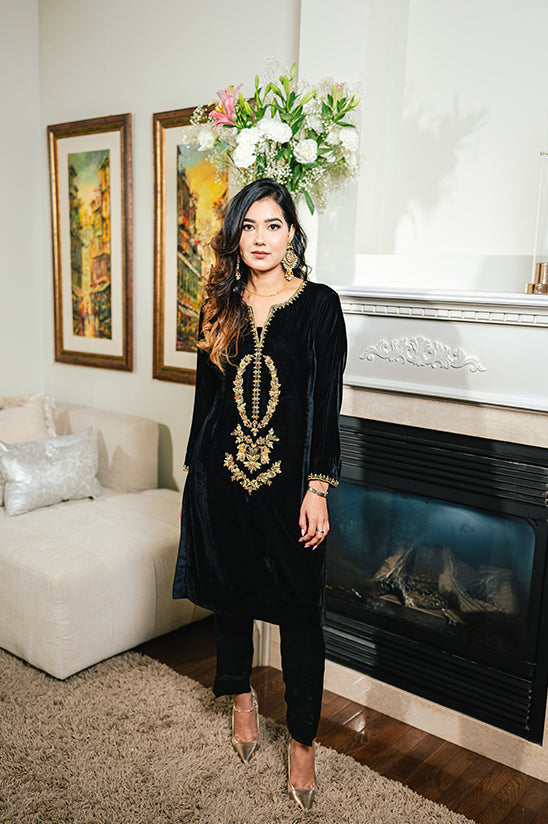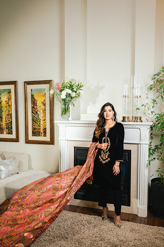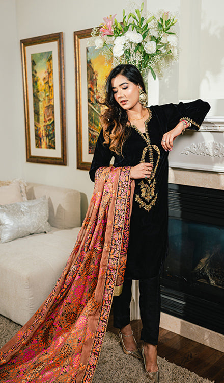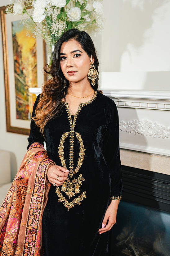 Classic and regal, Ilayda Black is a striking ensemble designed with timeless elegance. The straight shirt is beautifully enhanced with intricate handwork of gotta, tilla, and dabka on the neckline and sleeves, adding a rich traditional touch to the deep black base.