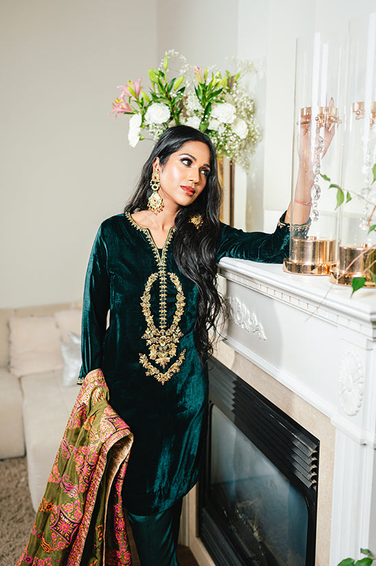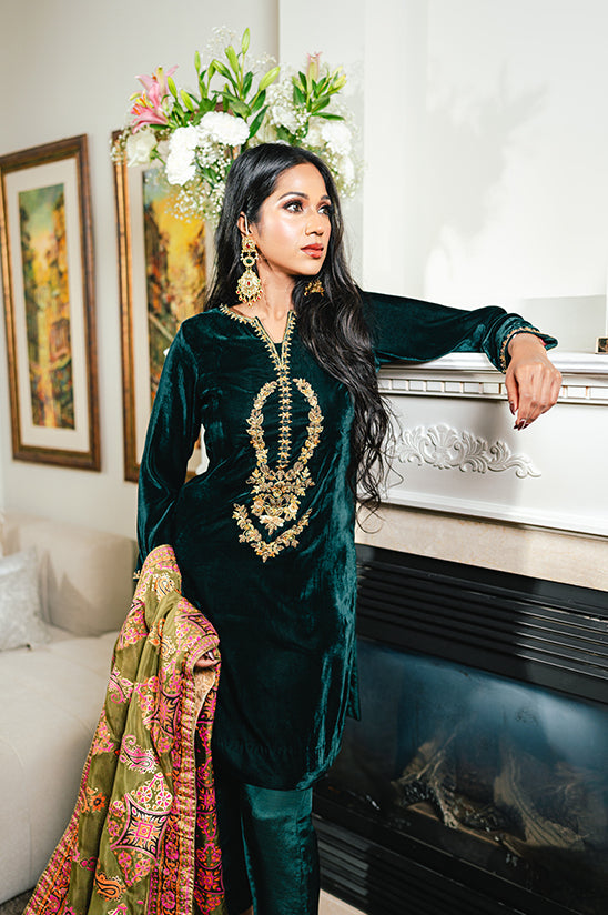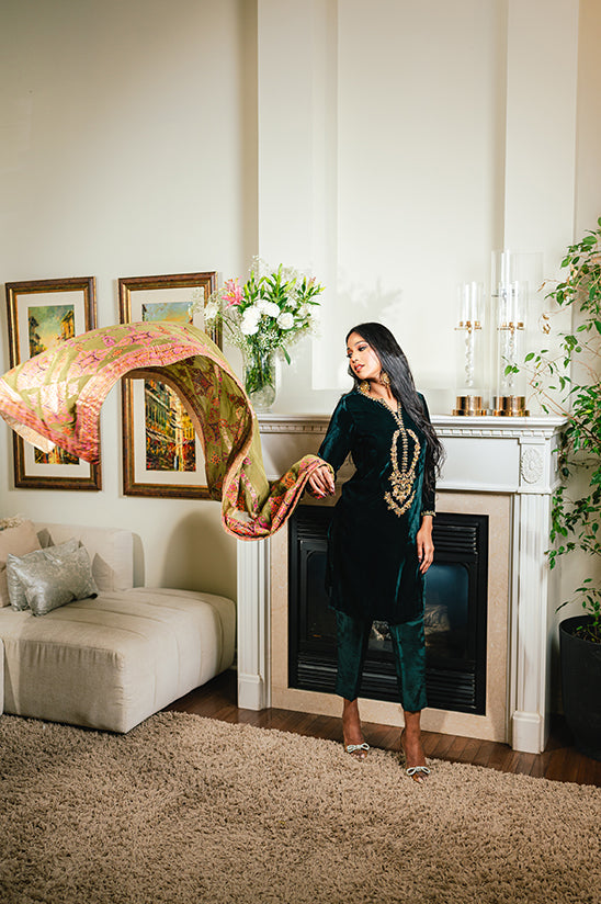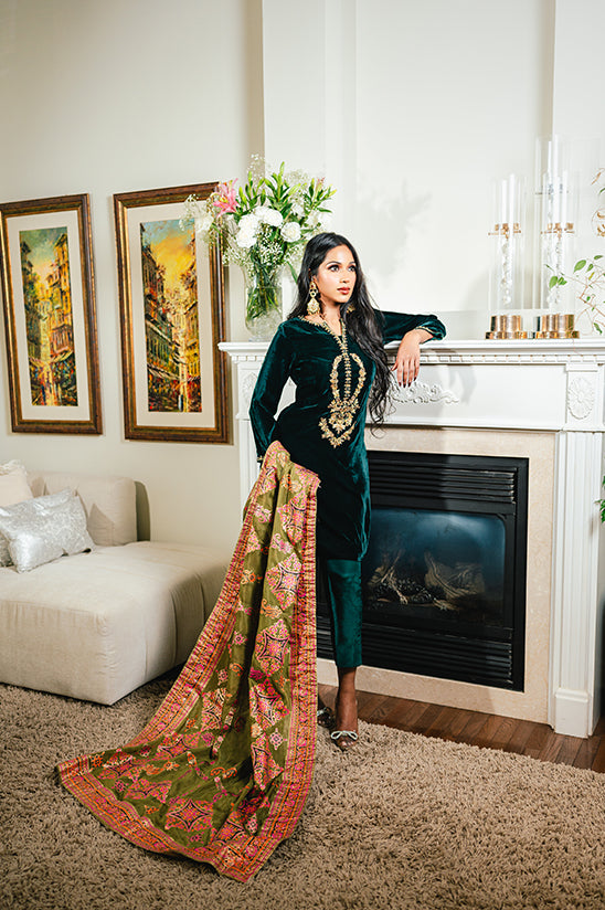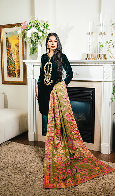 A celebration of heritage and finesse, Ilayda Green is a timeless ensemble featuring a straight shirt delicately adorned with handwork of gotta, tilla, and dabka on the neckline and sleeves. The intricate embellishments add a regal shimmer while keeping the silhouette elegant and refined.
