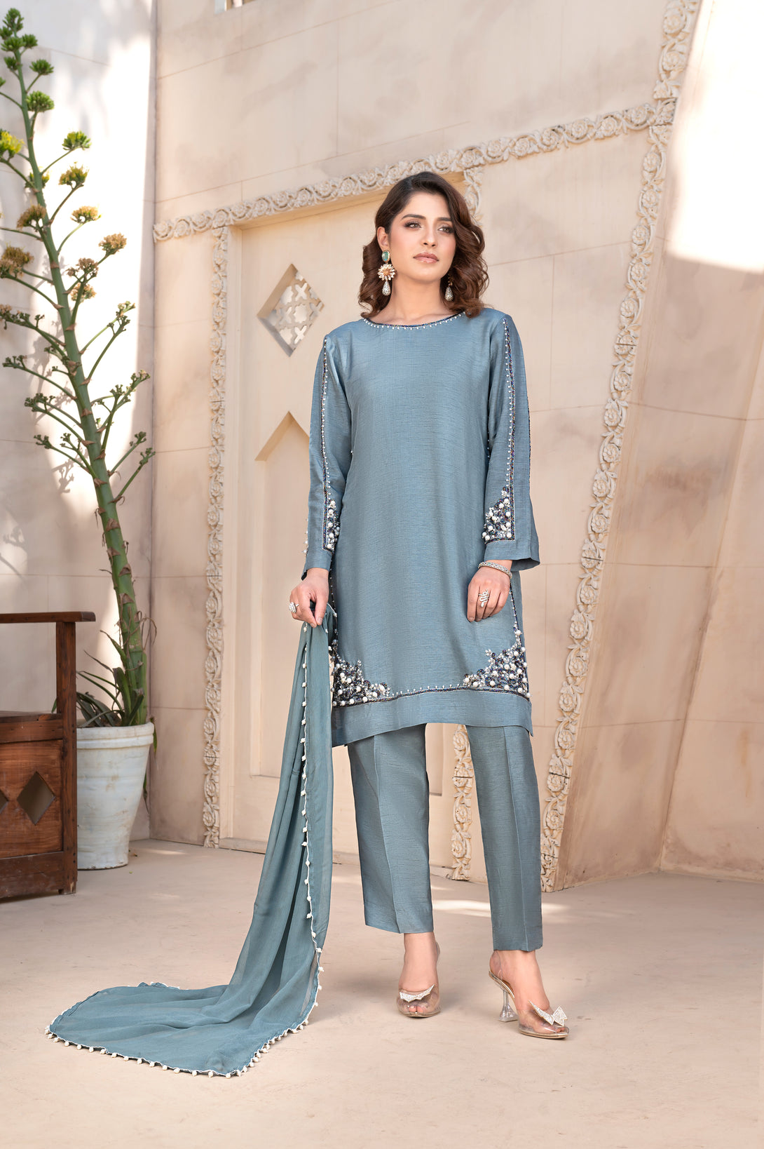 It is paired with classic straight pants for a graceful finish. To complete the look, a soft chiffon dupatta is edged with an elegant pearl lace all around, enhancing its refined and luxurious appeal.