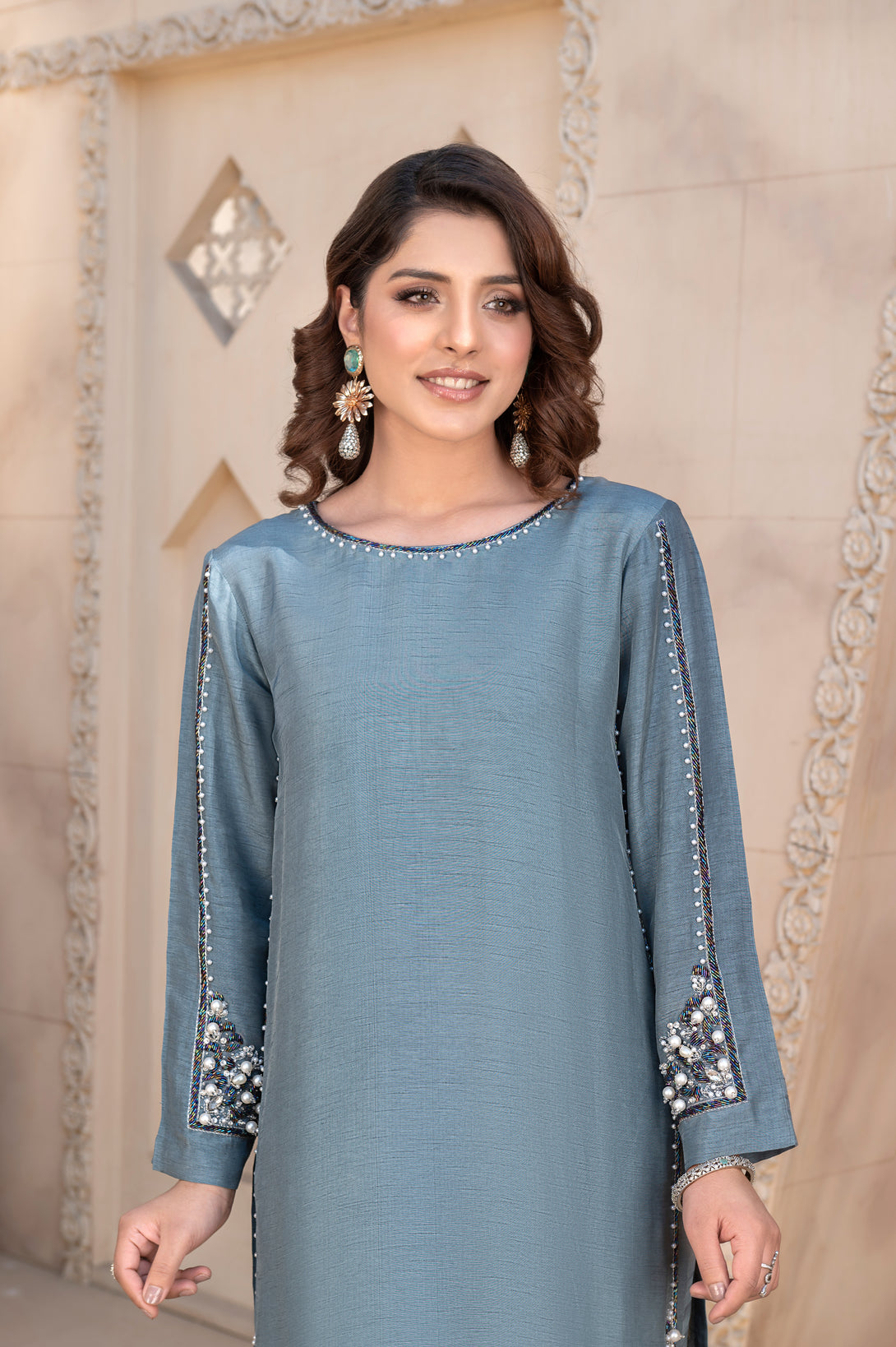 A masterpiece of delicate craftsmanship, Inaaya is a raw silk shirt beautifully detailed with handwork of cut dana and pearls on the sleeves, daman, and sides of the shirt, adding a subtle shimmer with every movement. The meticulous embellishments highlight the timeless charm of this elegant silhouette.
