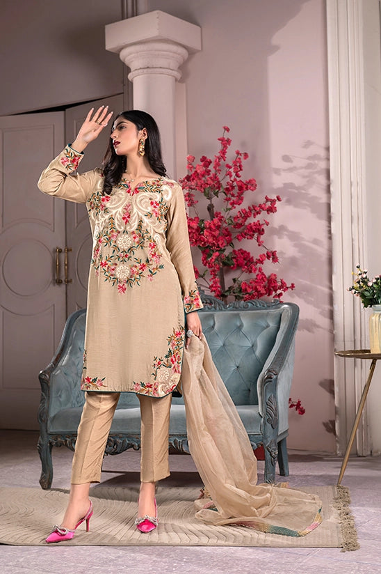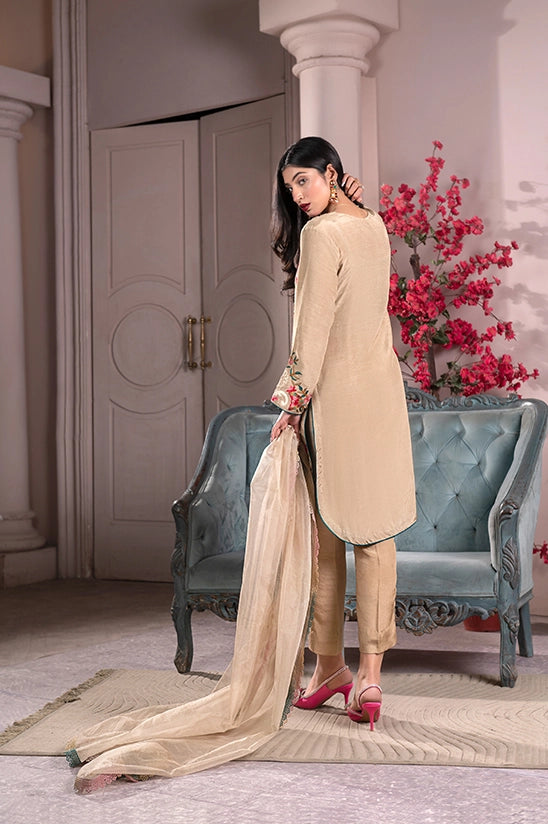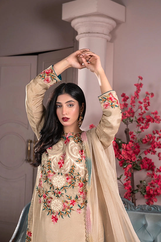 Embrace elegance with this chic ensemble, featuring a skin raw silk short shirt adorned with a beautiful multi-shade floral pattern on the front. It is perfectly paired with straight raw silk trousers creating a sleek and refined silhoutte. Completing this look with an organza dupatta featuring colourful lace detailing on all four sides, adding a touch of vibrancy and charm. It’s a ensemble that exudes sophistication and style.