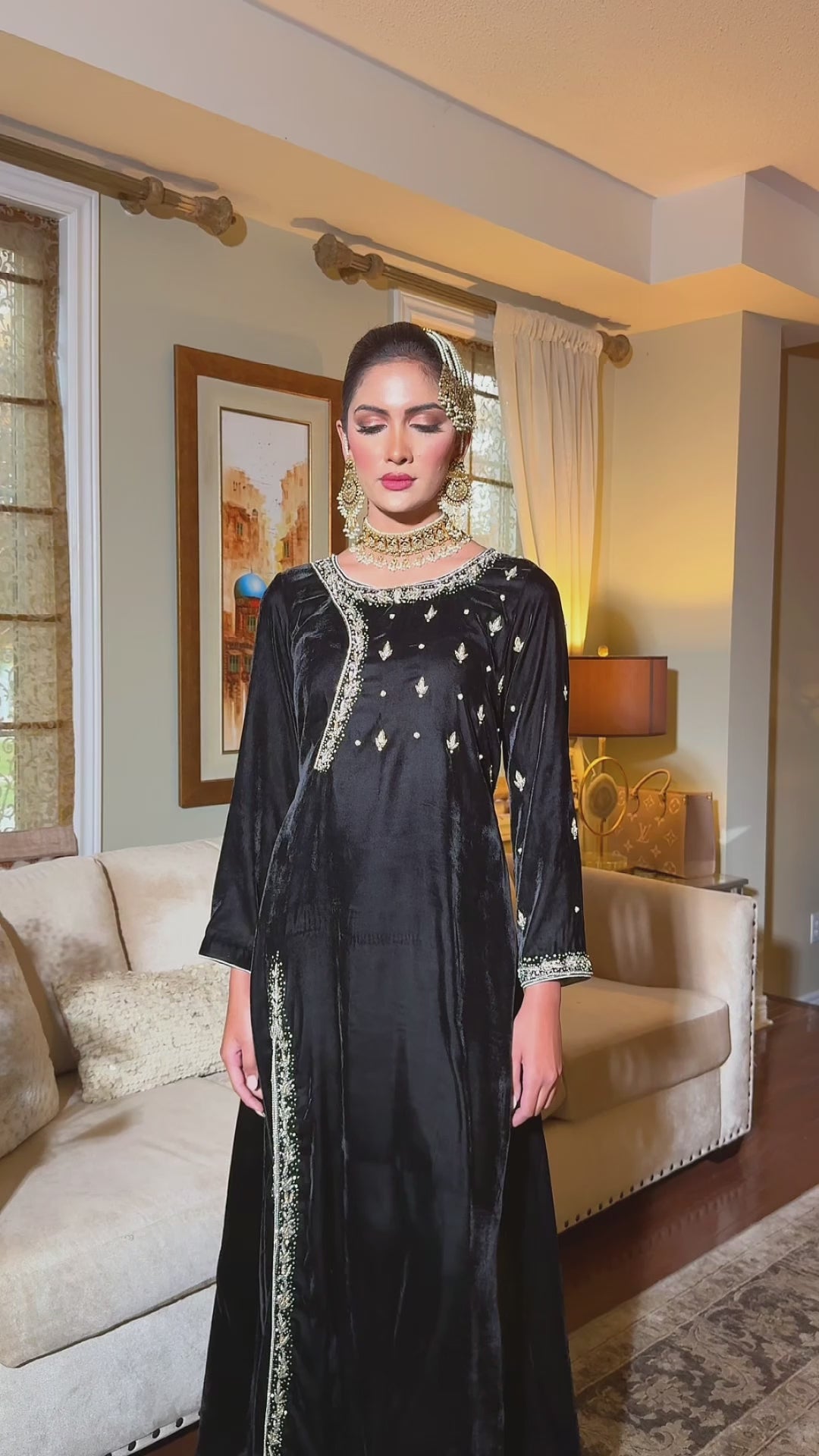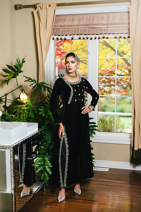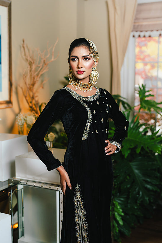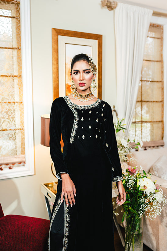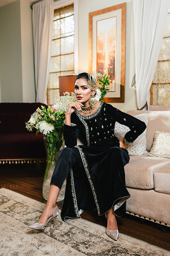 Bold and timeless, Inara Black is crafted on a luxurious long shirt with side slit, exquisitely detailed with handwork of kora, tilla, and dabka. The intricate embellishments glisten beautifully against the deep black base, creating a look that is both regal and modern.