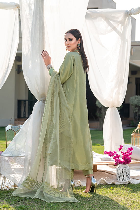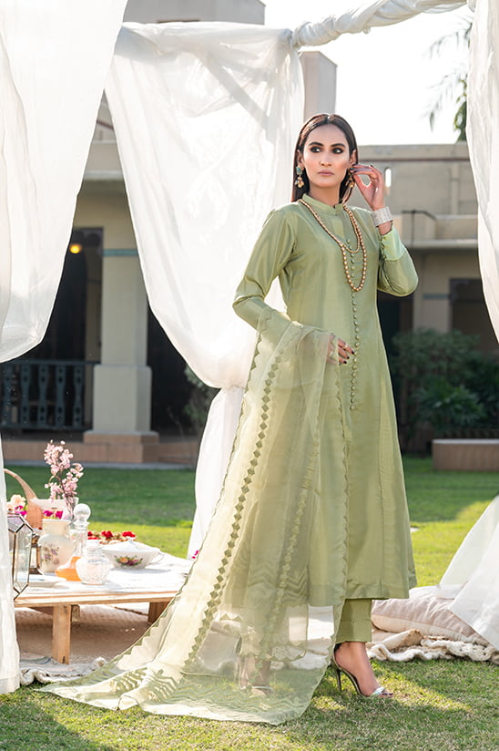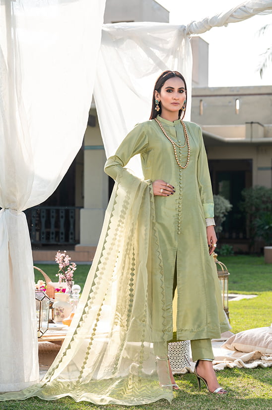 This Beautifully designed Katan Silk Dress with Kalian , Silk Buttons and Front Open style represents the true essence of royal looks. It is a perfect attire for a semi- formal festive gatherings. Its unique cuts and style has been carefully managed to give you a smart look. It comes with Katan Silk Trouser and Hand Made Rili Work Dupptta on Organza.