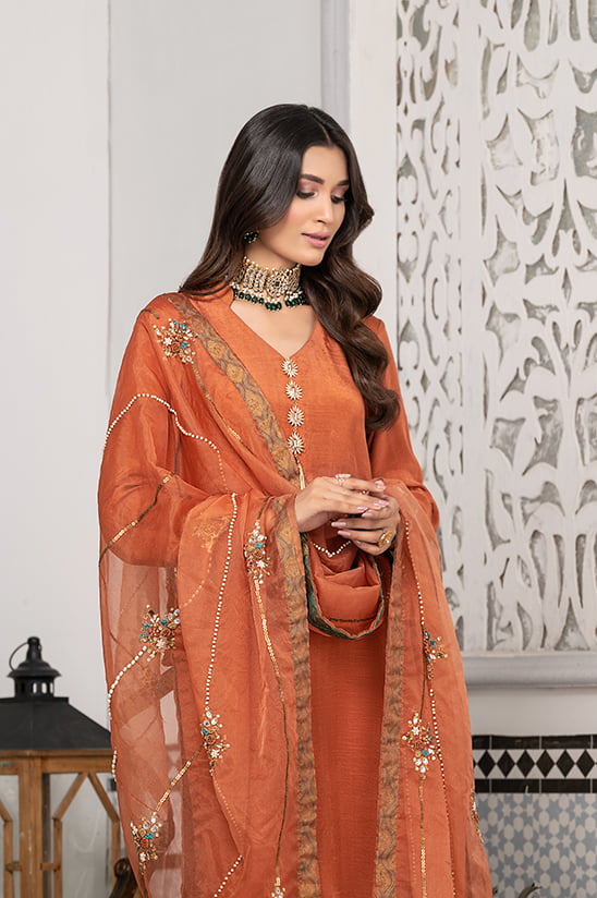 A glorious ochre canvas is set off in ’Mah e rosh’ featuring raw silk suit. Complimented by our plush heavily hand work embellished Dupptta with artsy Suzani Pearls, Sitara and French Knot details beautifully adorned with Ayesha Kiran’s quintessential artisanal handwork art and jamawar finishing in dupatta and suit, this design defines true flamboyance and an easy elegance which makes this the perfect look for any time of the day.