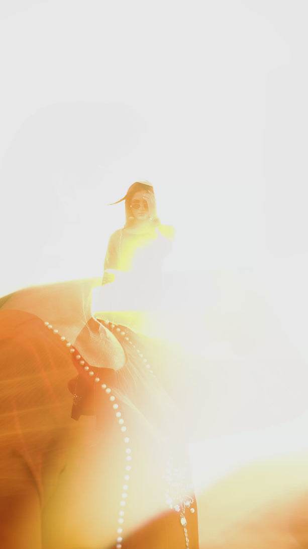This long silhouette in sumptuous tussel silk is meticulously adorned with intricate handcrafted stonework, luminous pearls, delicate French knots, and shimmering sitara, creating a graceful play of texture and light.