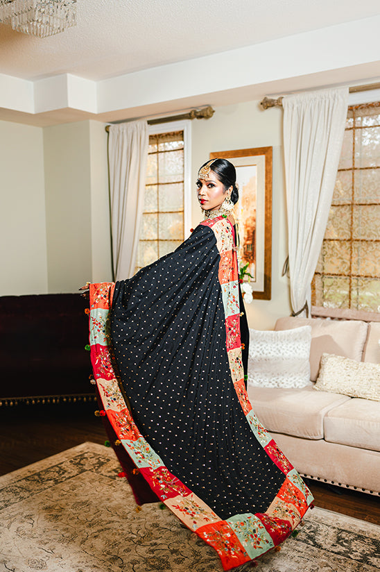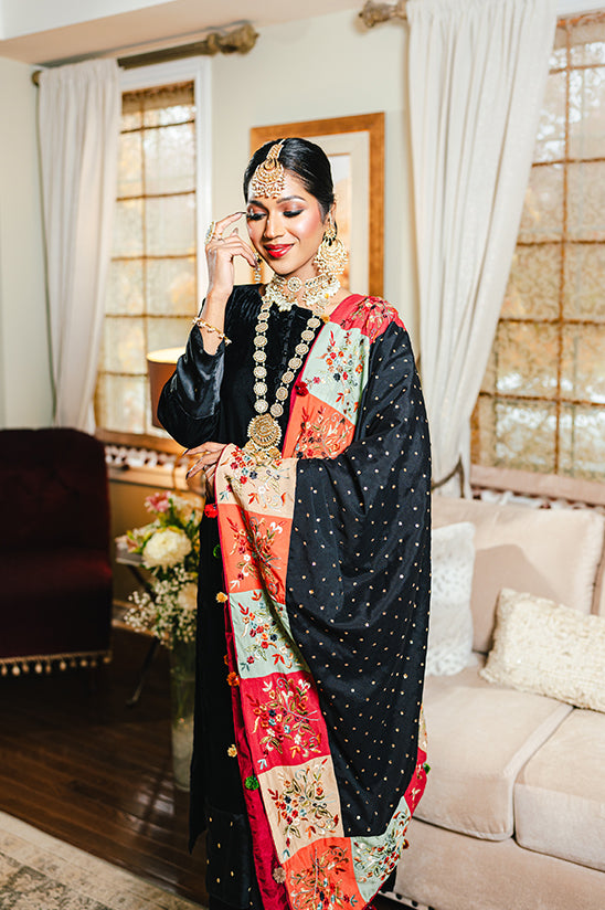 Timeless and versatile, the Nouran Black Shawl is crafted from luxurious silk and adorned with delicate hand embroidery and sitara work all around, adding a graceful shimmer to its classic appeal. Designed with handmade tassels and a smooth silk lining, this shawl is a perfect blend of elegance and comfort.