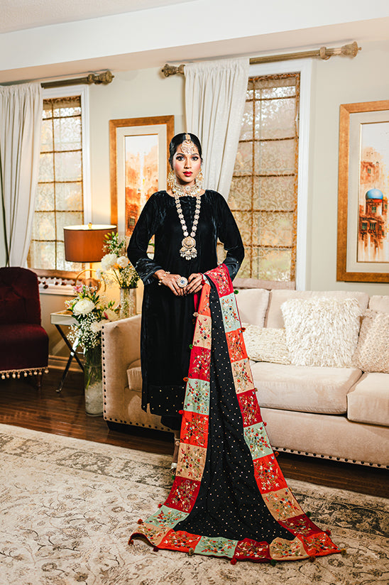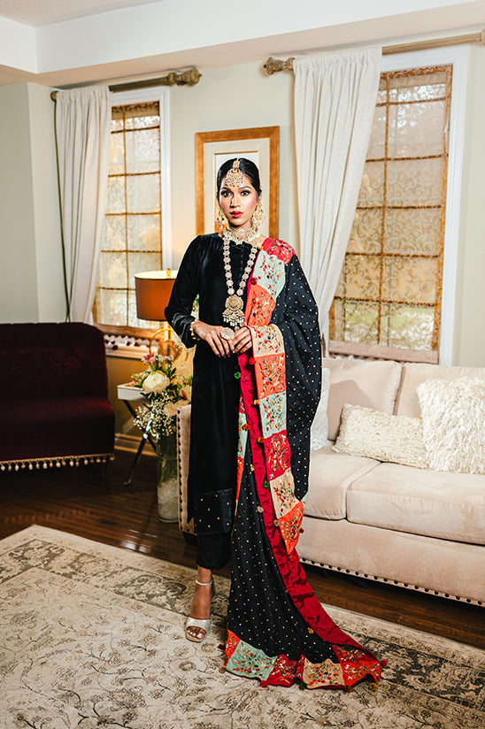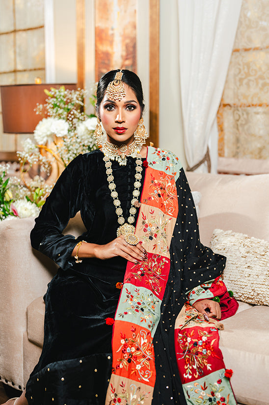 Style it effortlessly with our velvet co-ord sets for a sophisticated evening look, or let it elevate your festive and formal outfits. The Nouran Black Shawl can also be customized to your size and style preferences, making it uniquely yours.