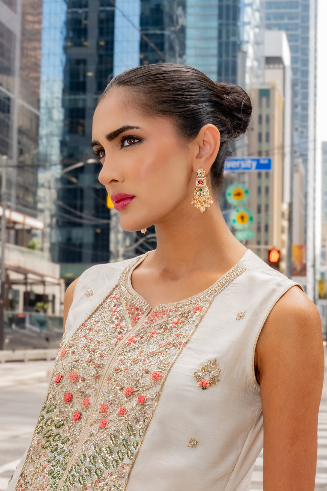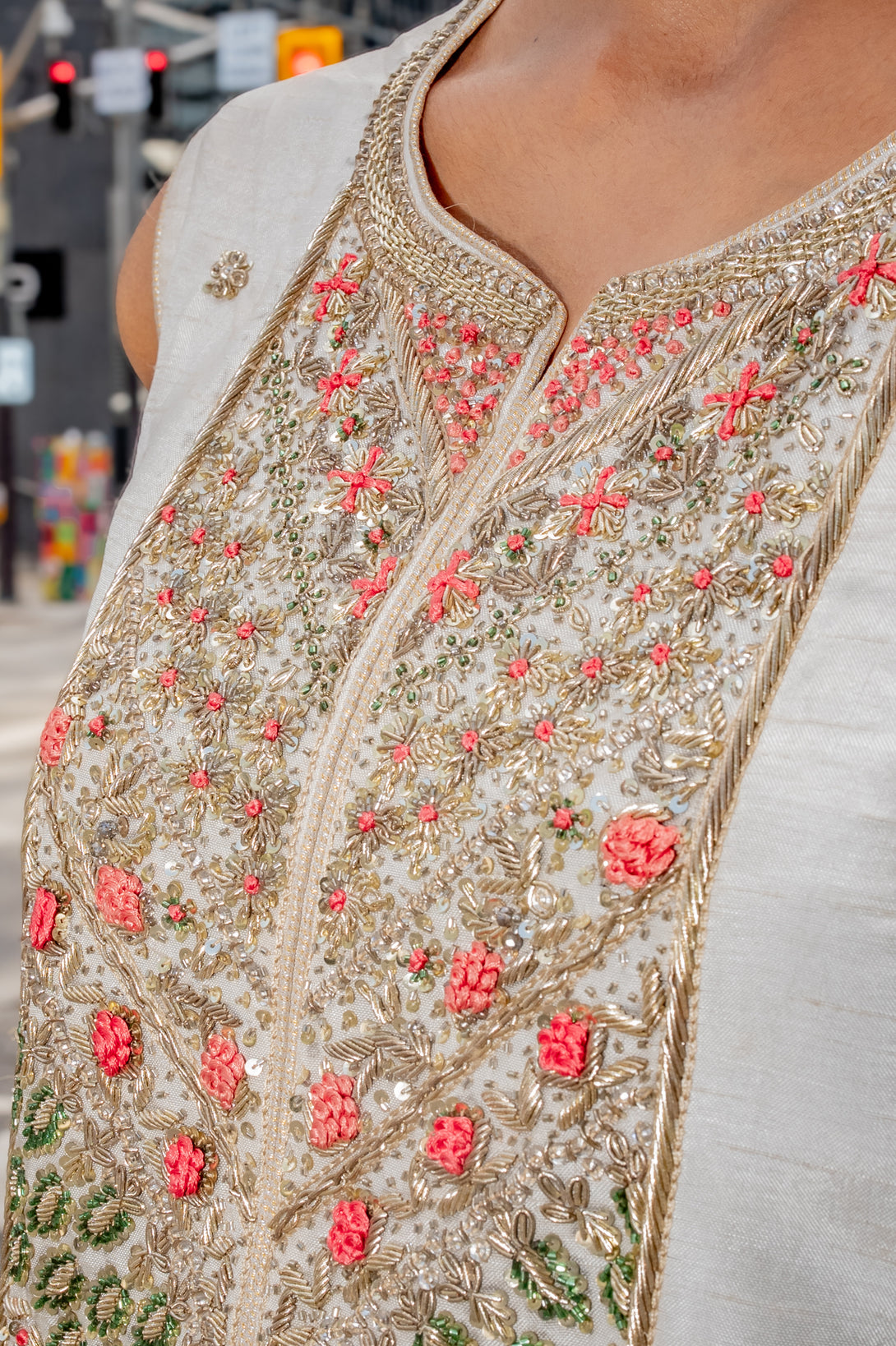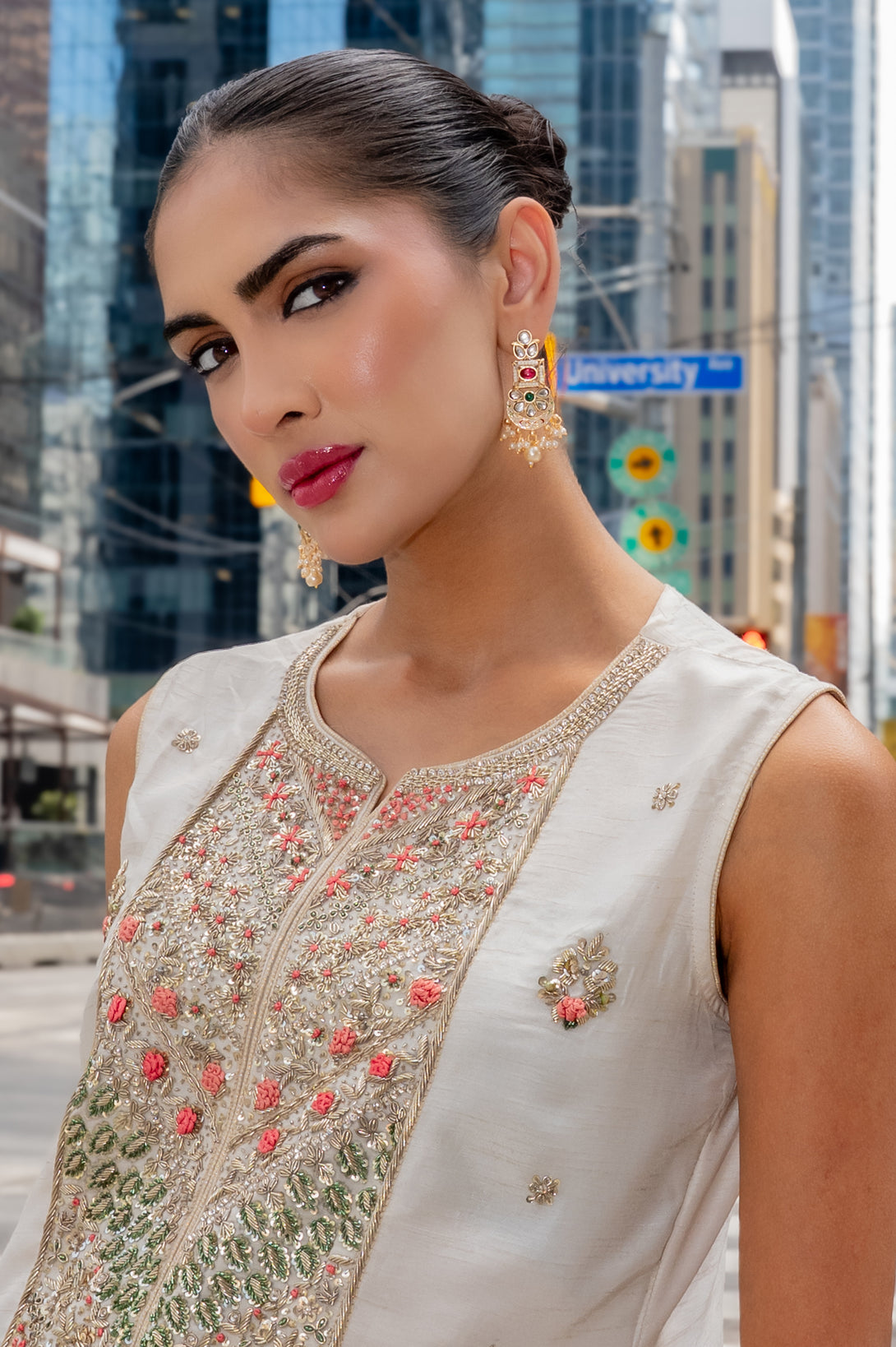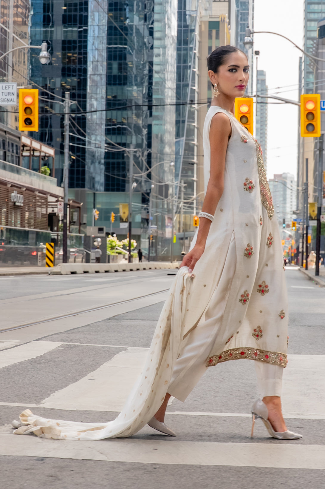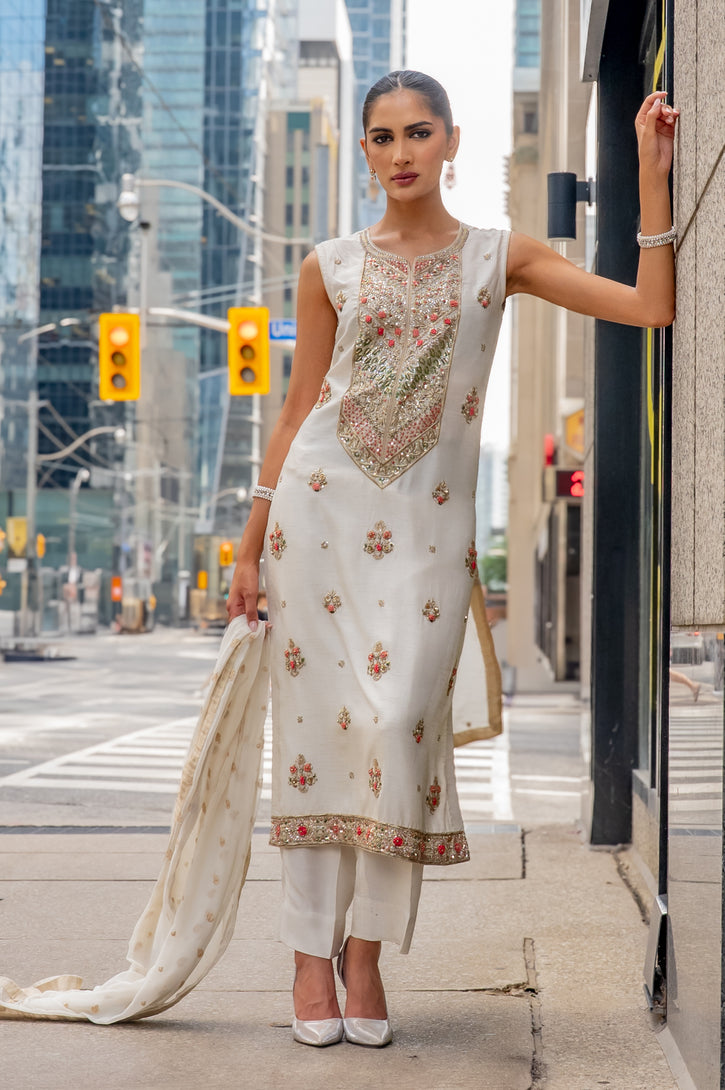 Elegant and timeless, Parissa is a graceful ivory ensemble crafted from pure raw silk. The straight long shirt is adorned with exquisite hand embroidery featuring dabka, tilla, sitara, and delicate French knots, showcasing the finesse of traditional craftsmanship with a modern appeal.
