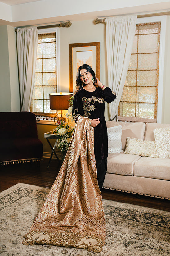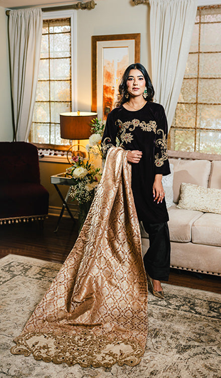 For those seeking an elevated look, you can pair it with an optional jamawar shawl featuring exquisite handwork, available separately for $185.