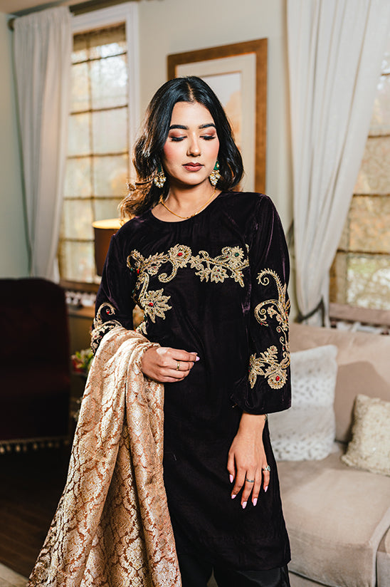 Elegant and timeless, Renisa Brown is crafted on a rich straight shirt with intricate handwork of doori, tilla, sitara, and stones, creating a refined yet festive appeal. Paired with a traditional shalwar, the ensemble offers a graceful silhouette that blends classic charm with modern poise.