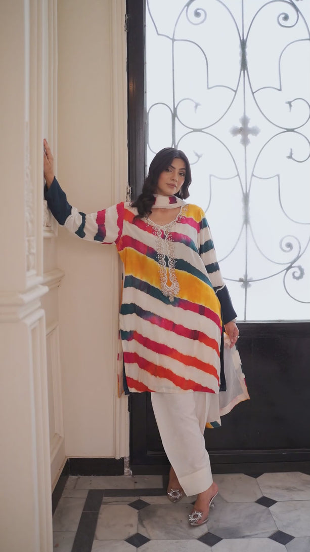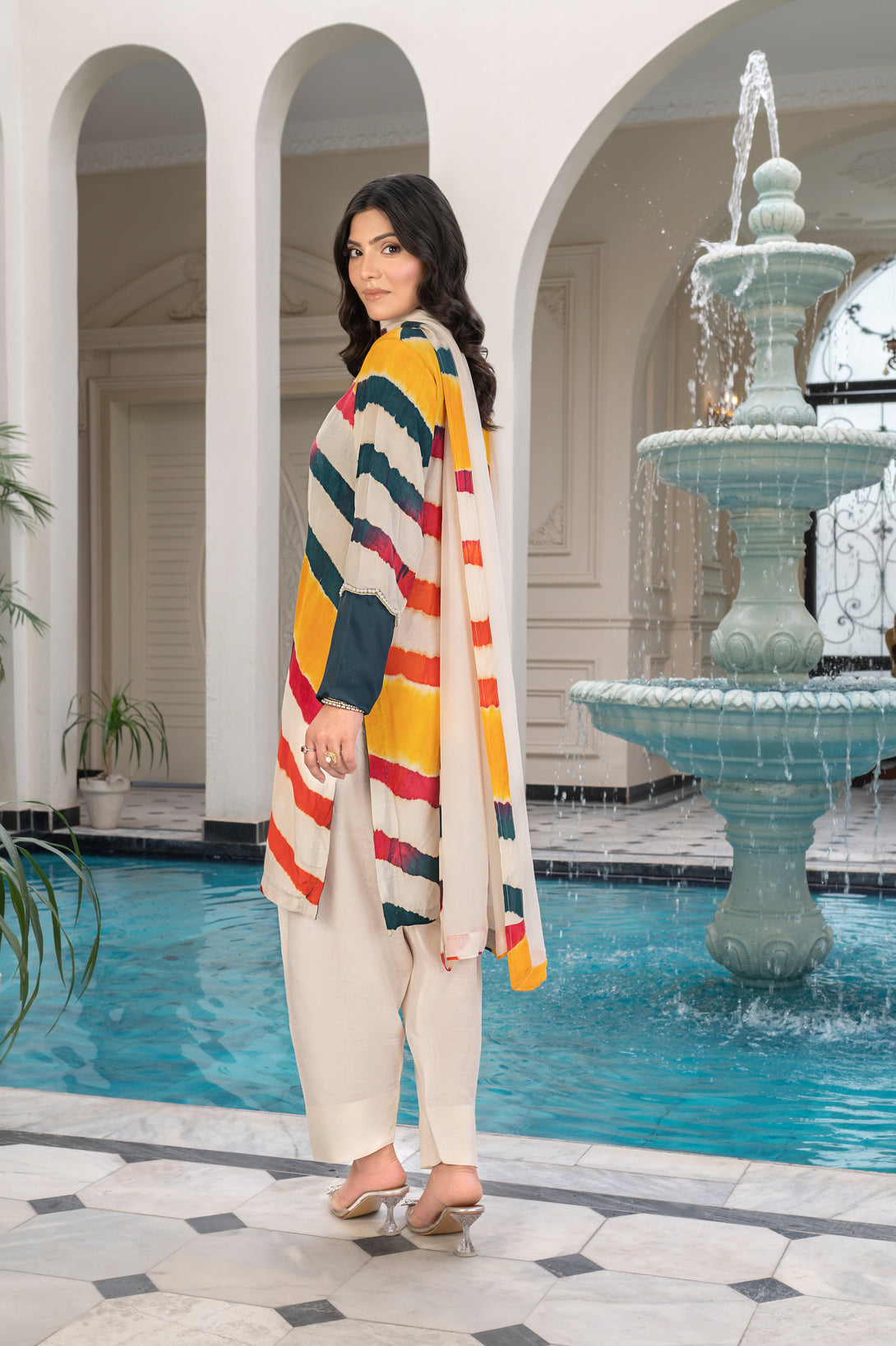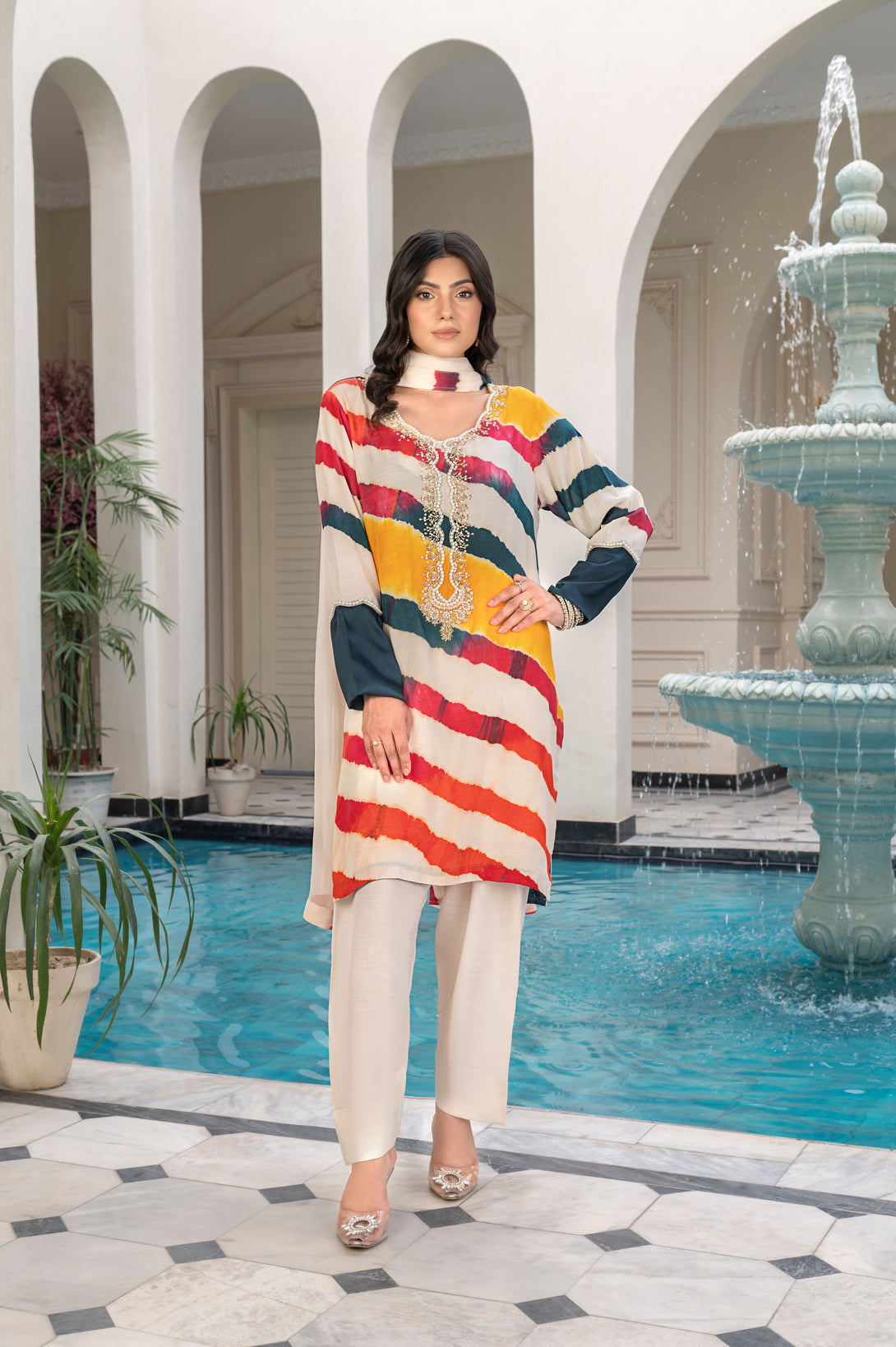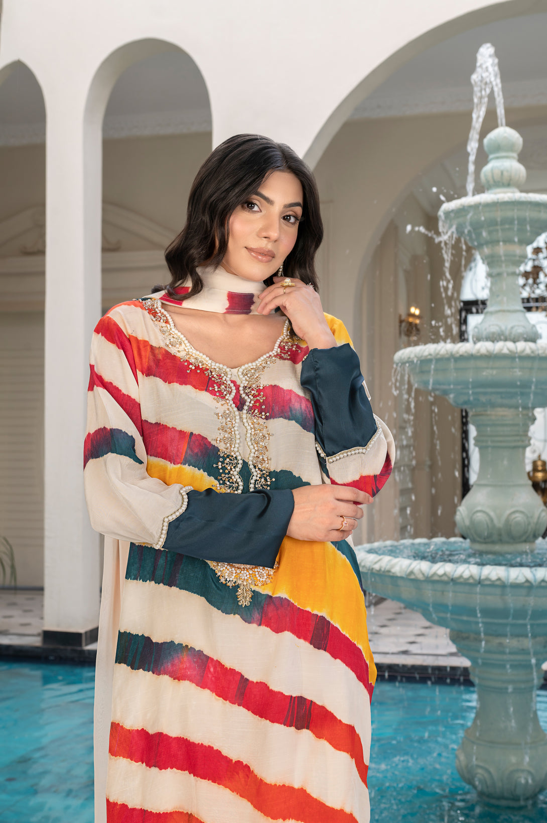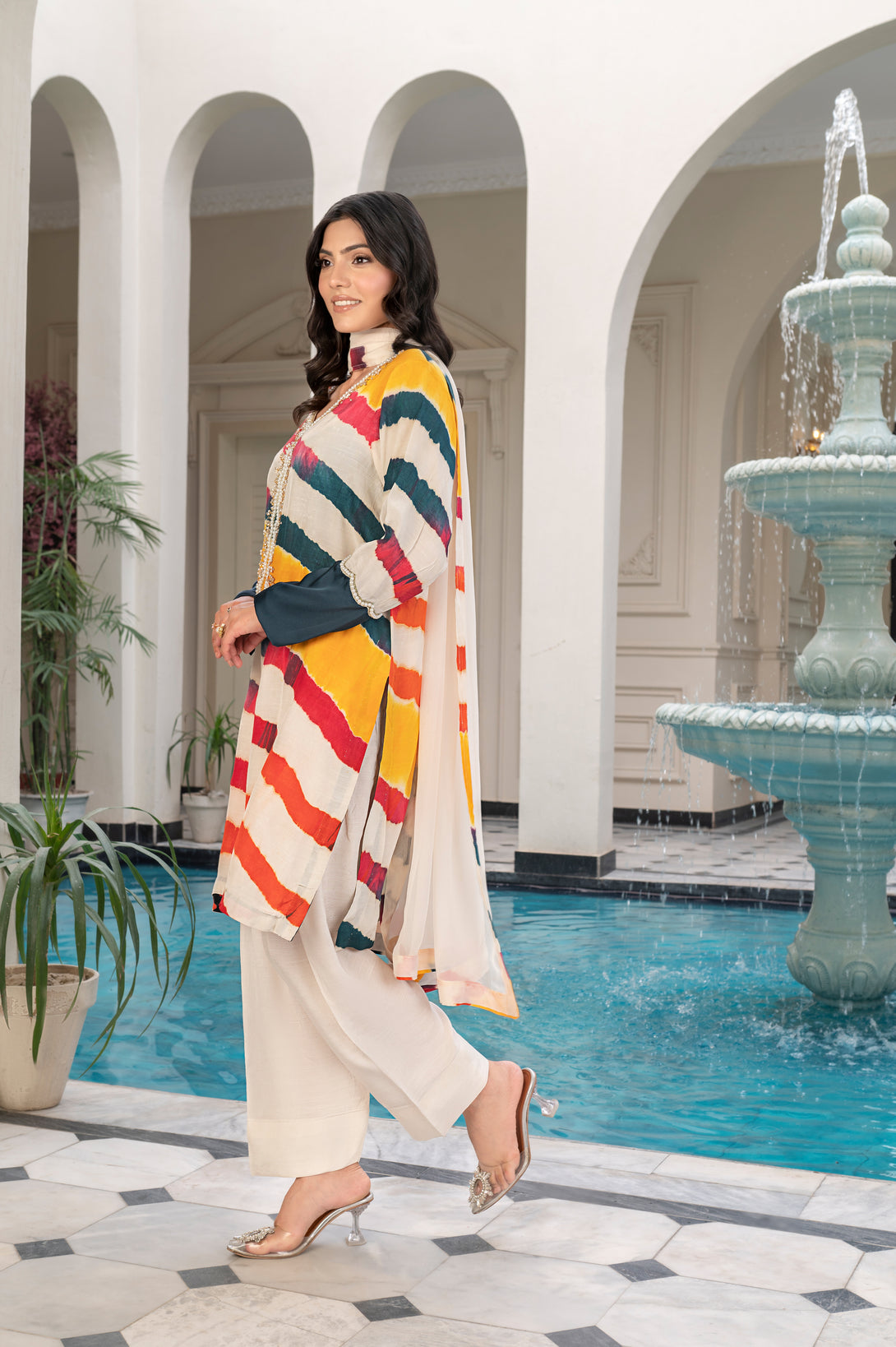 It is paired with a flowing farshi shalwar, balancing tradition with effortless grace. Completing the look is a soft chiffon dupatta, finished with a tie-and-dye border all around, enhancing the contemporary appeal while keeping the ensemble rooted in heritage.