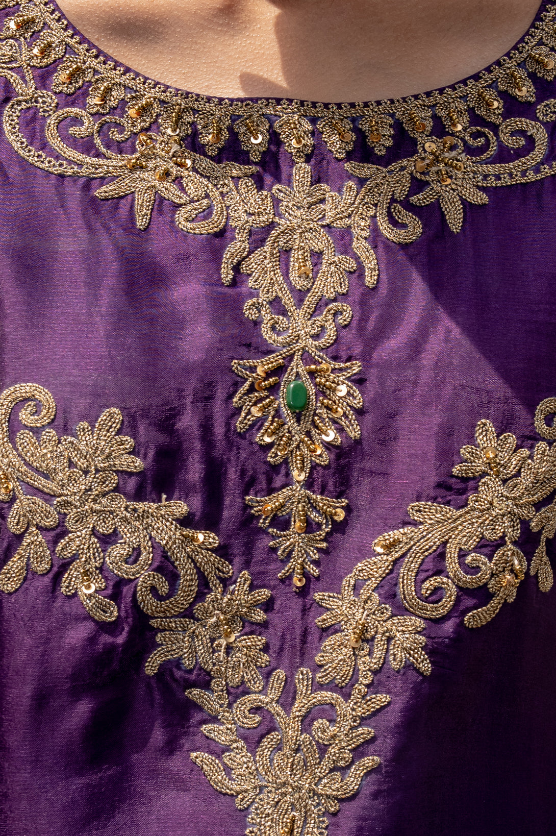 The neckline and sleeves are delicately adorned with intricate handwork of doori and tilla, further highlighted with subtle stone embellishments that add just the right touch of sparkle. This meticulous detailing reflects fine craftsmanship and enhances the regal aura of the outfit.