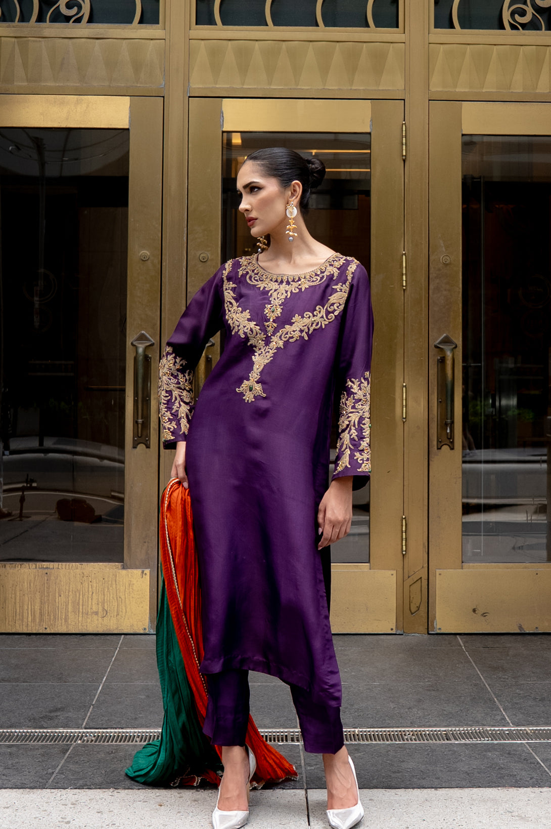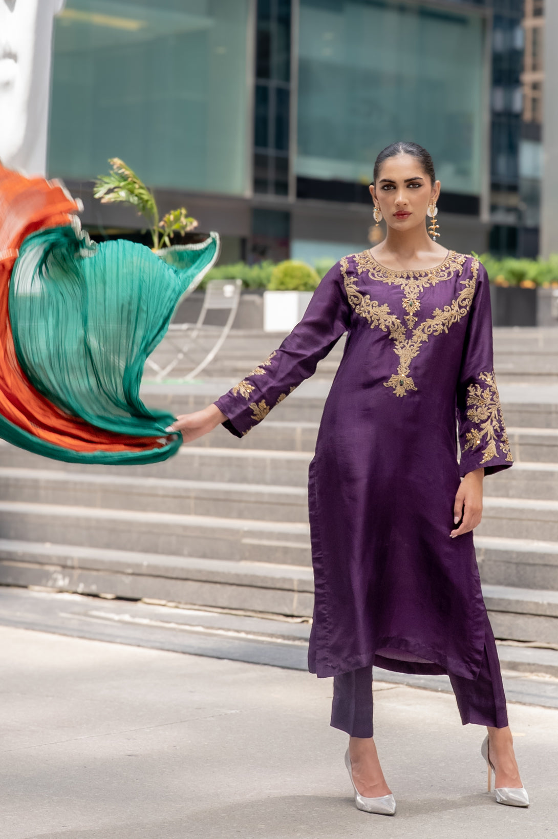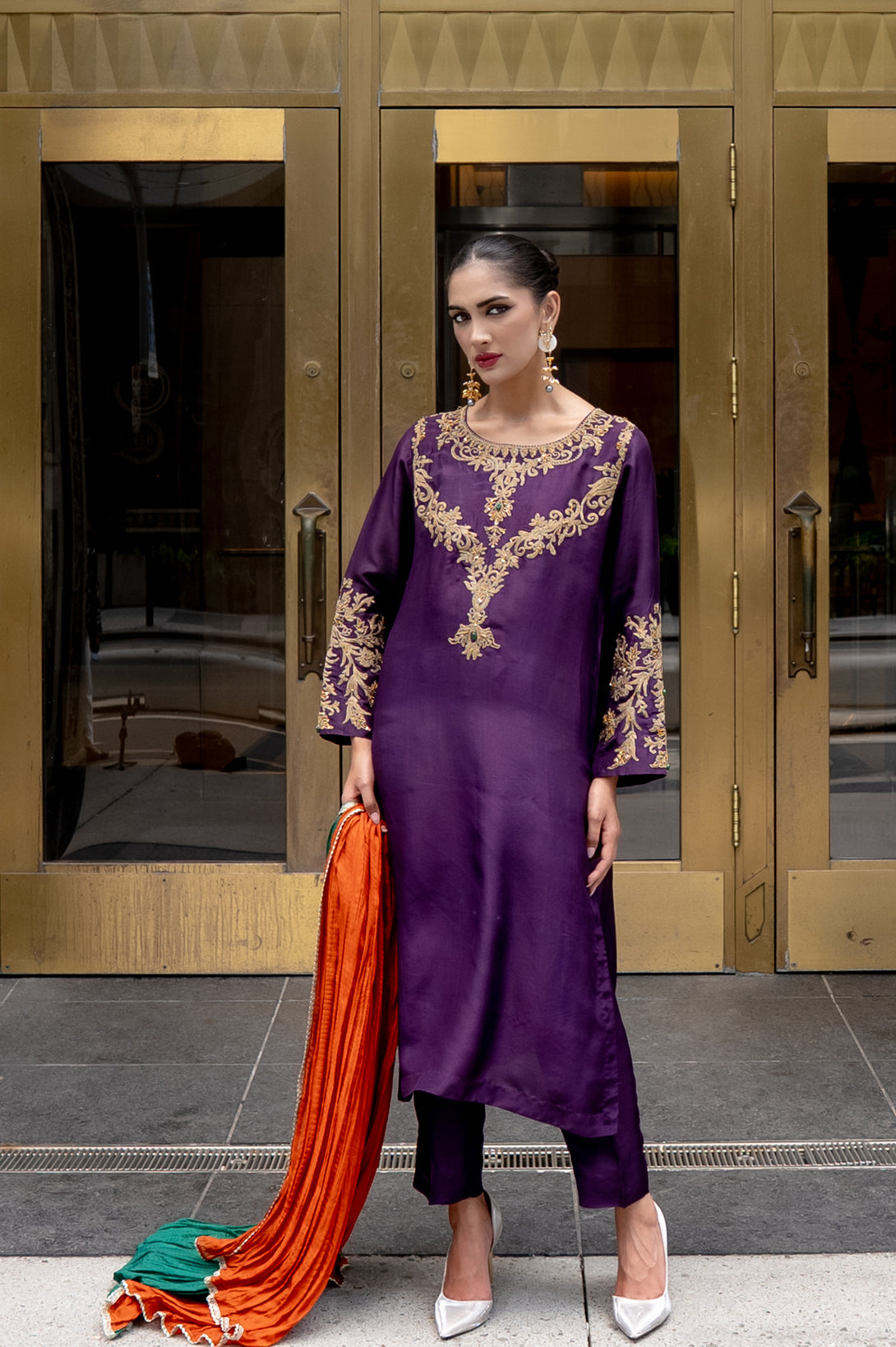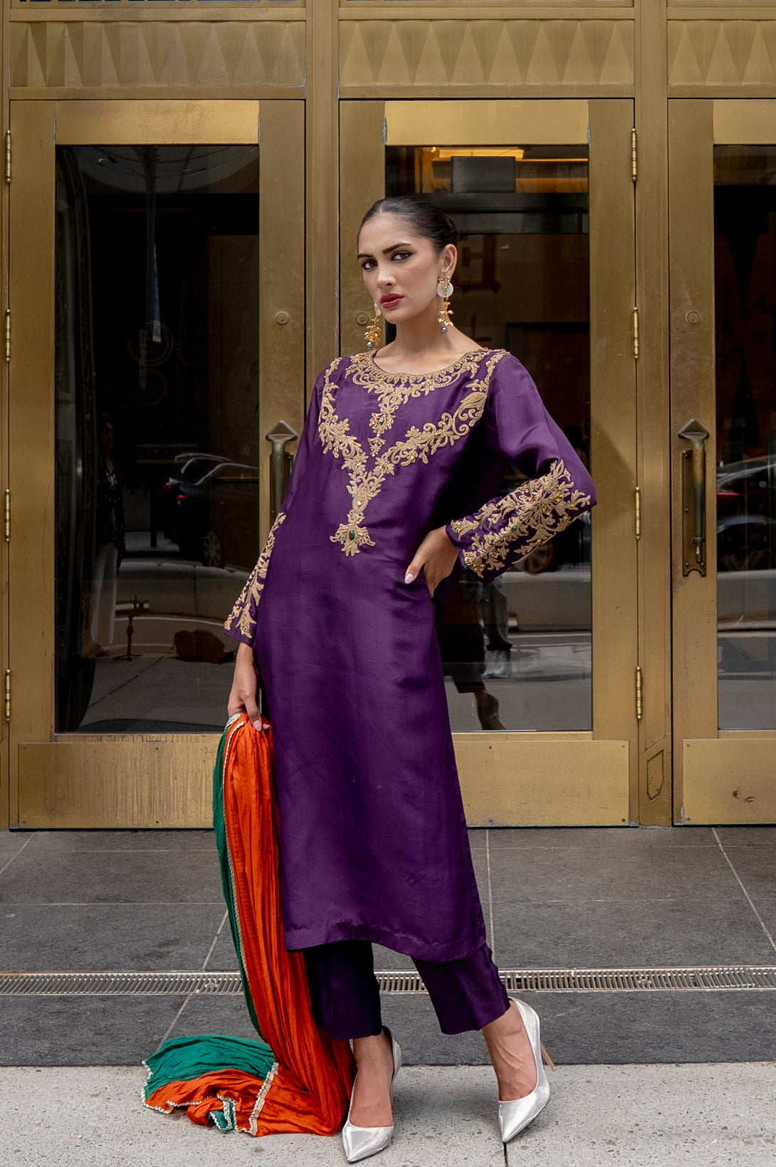 Step into timeless elegance with Riwayat, a classic ensemble that beautifully blends tradition with sophistication. Crafted on pure silk, the straight-cut shirt and trouser exude a graceful silhouette, making it a perfect choice for both festive and formal occasions.