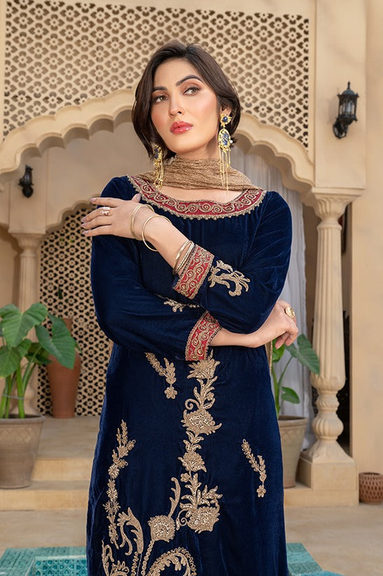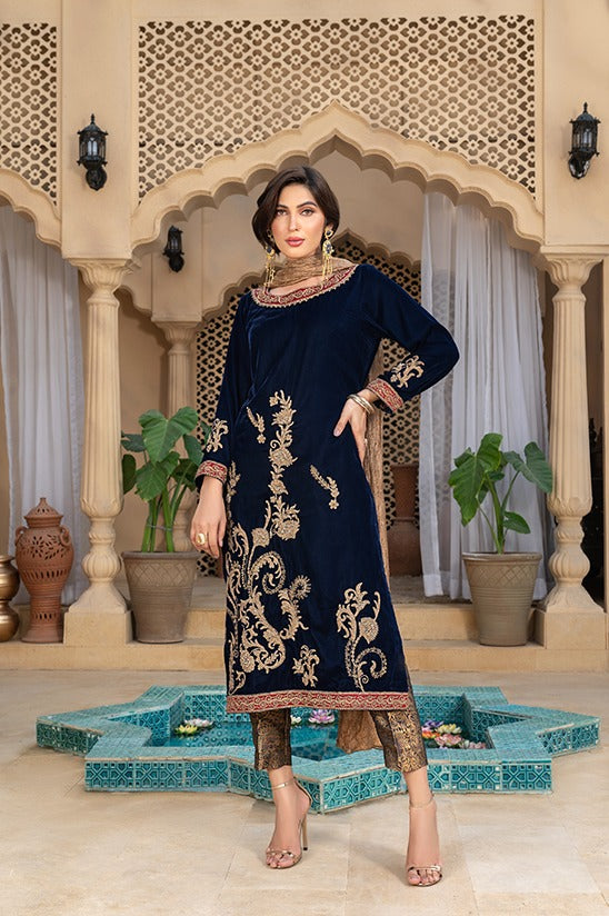 A straight Velvet Royal Blue Shirt, incorporated with captivating golden Tilla, Dori and Dabka handwork, further enhanced by dainty patches around neckline, sleeves and Daman, paired up with A customary Jamawar Trouser combining copper and navy-blue tones, and a shimmery copper colored Crush Silk Dupatta.