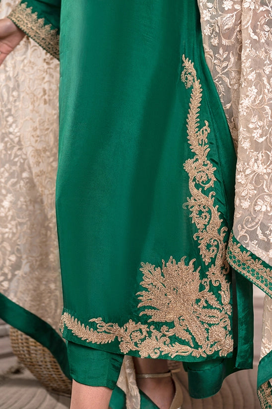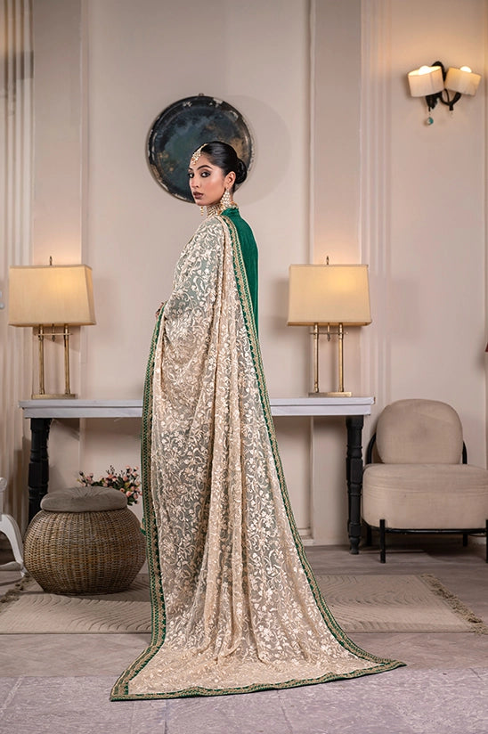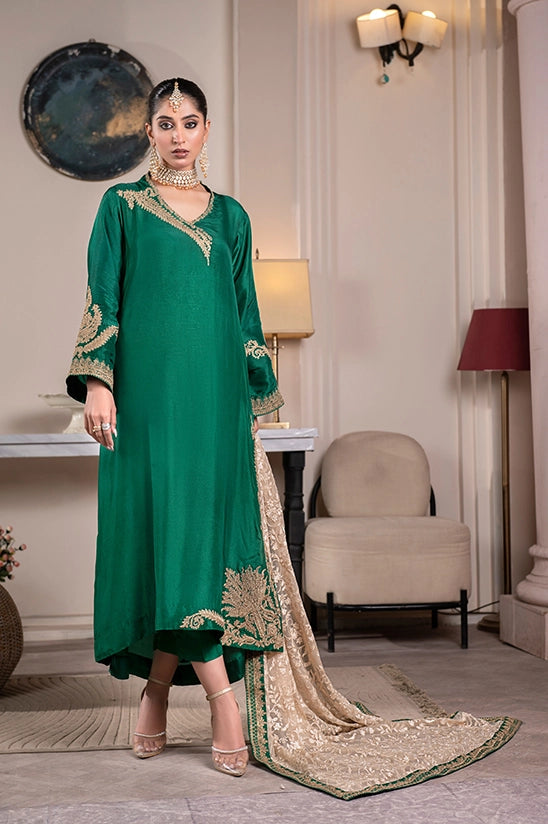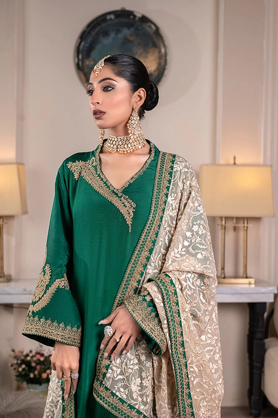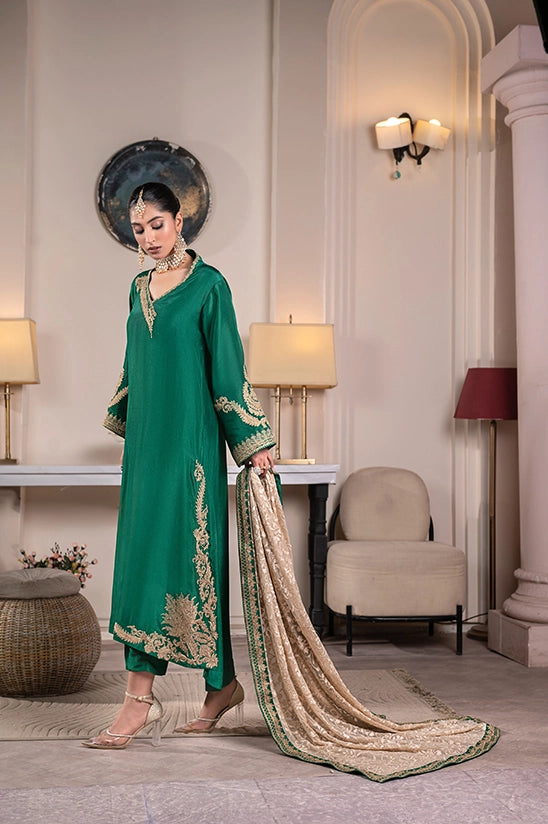 This ensemble is elevated where a bottle green Angrakha style shirt in pure silk steals the spotlight with its intricate tilla work of aari and handowrk of Kora on neckline, sleeves and daman. Paired with sleek straight pants, where every detail speaks of refined charm. The beauty of this ensemble lies in the meticulous craftmanship, with all four sides of the chiffon dupatta finshed with machine aari work and handwork. It’s a statment of regal elegance, charm and timeless beauty.