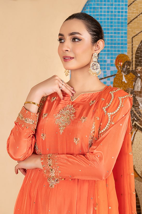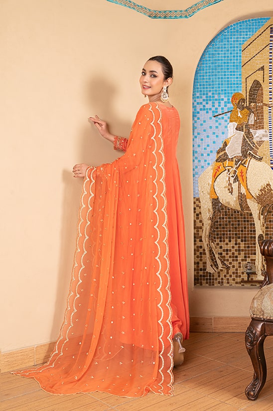 A Regal and bold ensemble with kora dabka and tilla work in the vibrant hues of orange colour with shimmering gold. It accompanies a beautiful chiffon dupatta with panni scallops and work all around. This gorgeous and classy silk maxi dress shows the intricately detailed embellishments and would certainly create a phenomenal statement for festive or party looks.