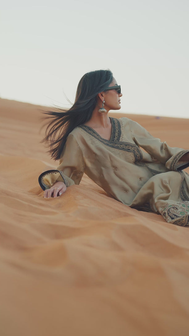 Paired with a straight palazzo and styled with a graceful black chiffon dupatta finished with Jamawar accents, this ensemble reflects timeless sophistication and effortless grace.