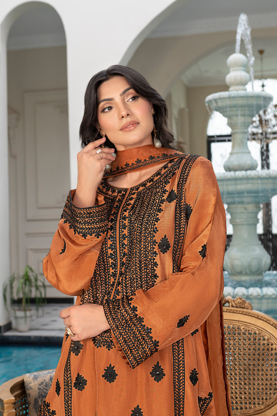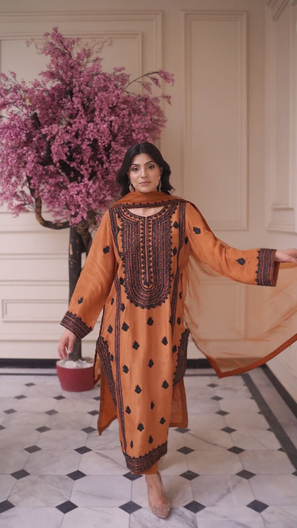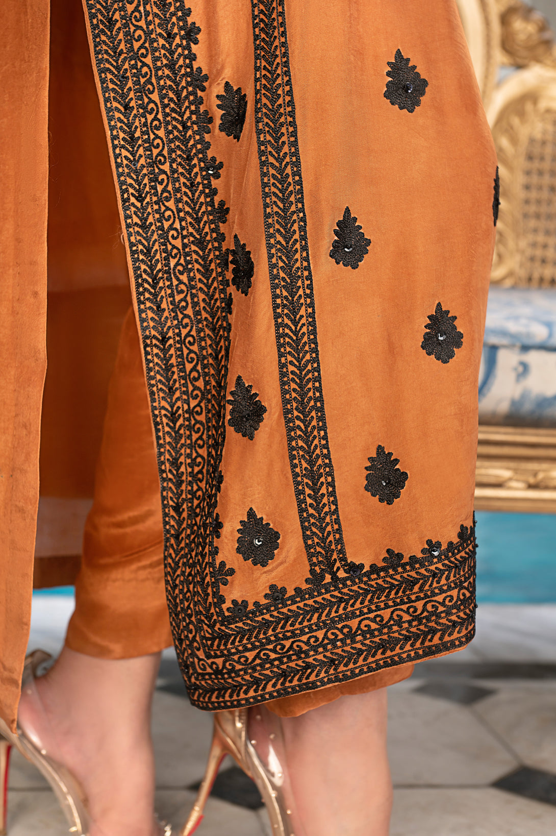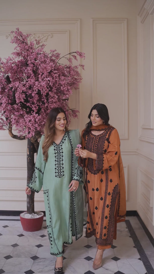 Zehra is a statement of refined elegance, designed to embody timeless sophistication. The silk shirt features bold yet graceful black aari embroidery, further elevated with delicate handwork of sitara, adding just the right amount of sparkle to the ensemble.